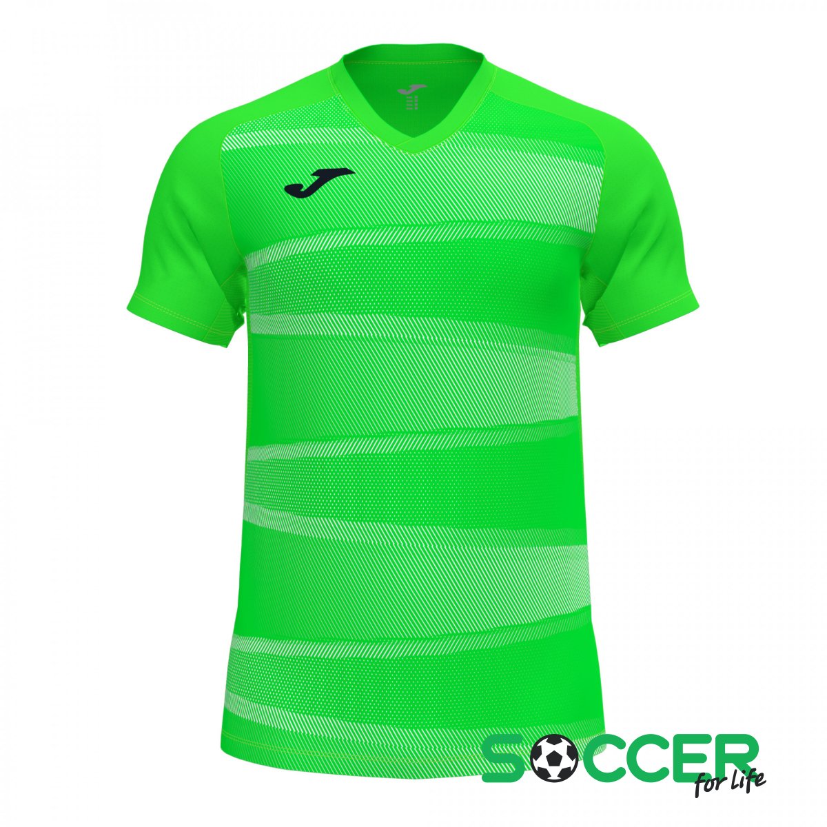 Спереди футболка дополнена контрастными горизонтальными полосами и логотипом Joma в области груди.