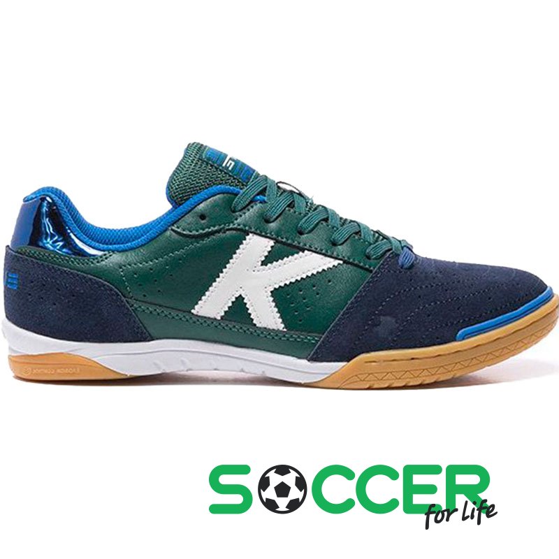 Кросівки зальні Kelme ELITE 55.904.573 колір: темно-синій/зелений. Матеріал: натуральна шкіра, поліестер і філон. Футзалки призначені для професіоналів, які потребують кращих технічних характеристик і матеріалів. Верхня частина моделі виконана зі шкіри, бічна і передня частина має отвори для повітропроникності. Передня частина має вставку. Вона може витримувати великі навантаження на ігровому полі. Технологія виробництва K-FLEX є гарантією чіпкості футзалок з покриттям залу. Особливості: чіпкість з поверхнею, надійна фіксація п'ятки і гомілки стопи, легкість, гнучкість, укріплена носова частина.
